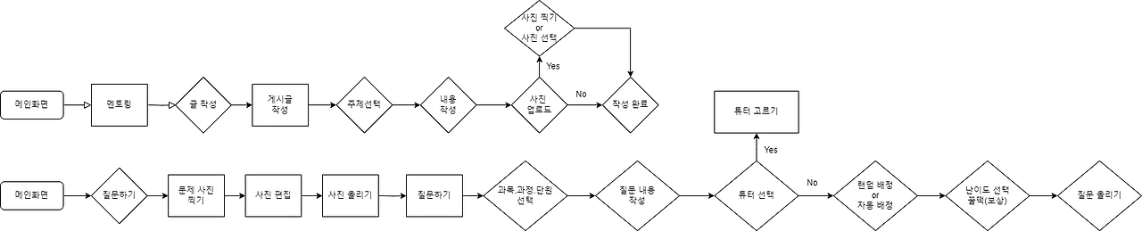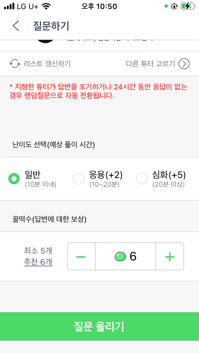 튜터 선택(리스트 갱신, 다른 튜터 고르기) →난이도 선택, 답변에 대한 보상 설정