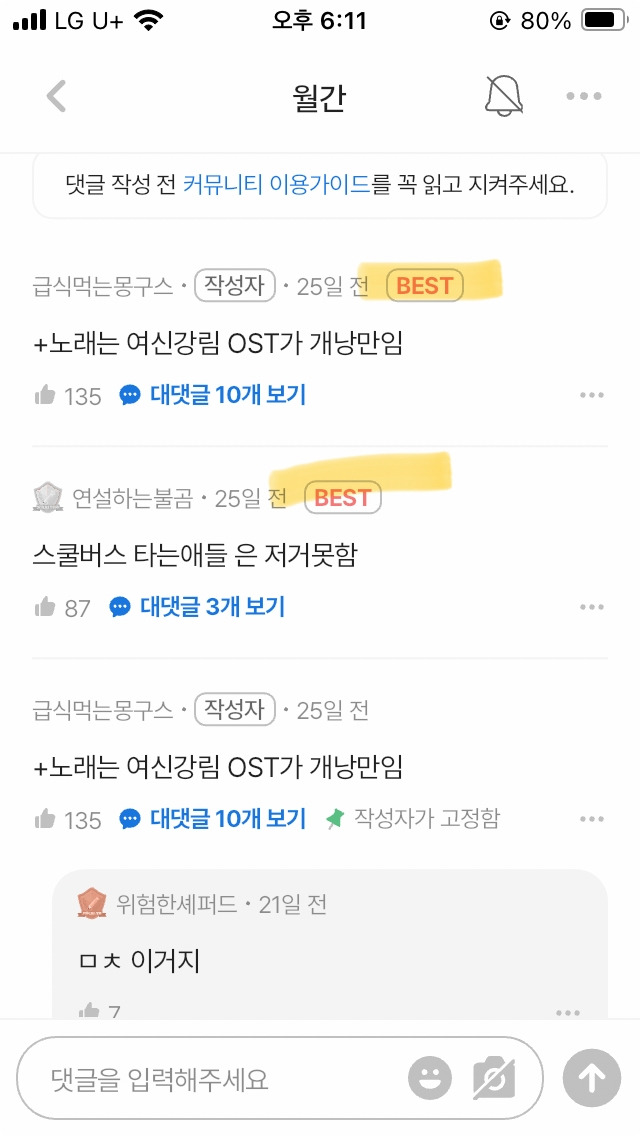 오늘 학교의 경우, BEST댓글을 표시한다.