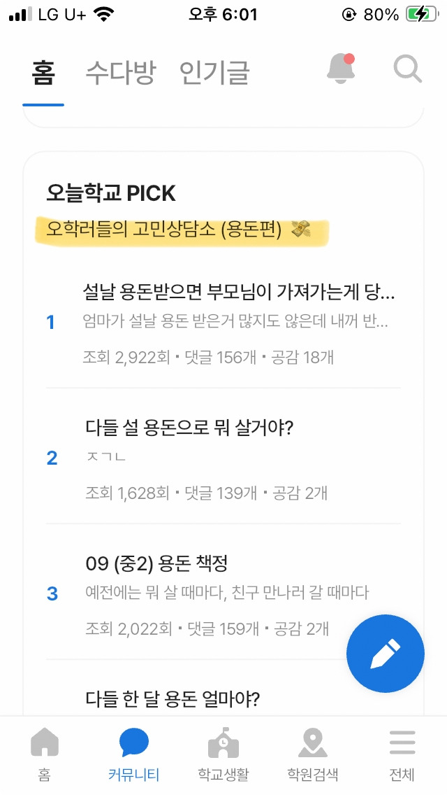 ex) 용돈관련 고민: 오학러들의 고민상담소(용돈편)