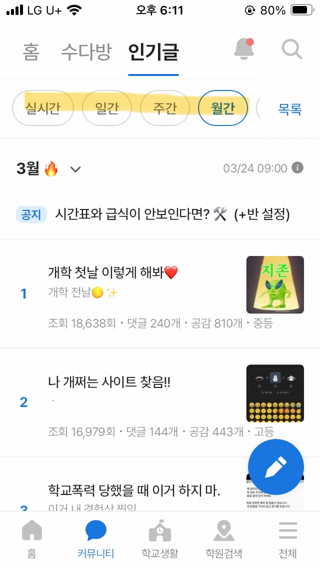 3.인기글 페이지 카테고리가 세분화 되어있다.