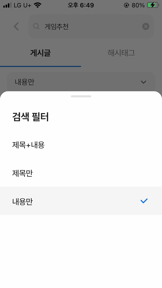 •검색시 제목+내용, 제목, 내용 필터가 있다. / 해시태그 검색 가능