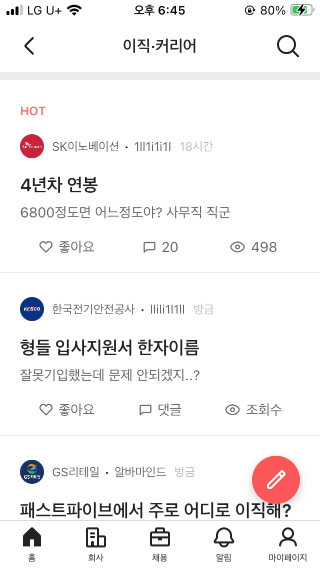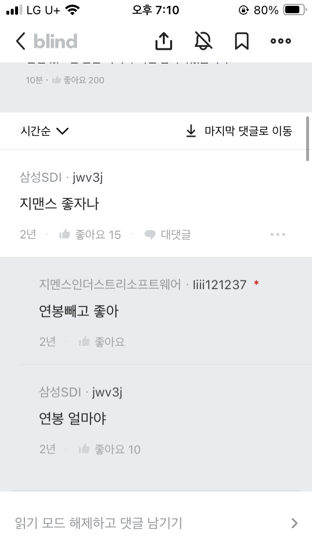 블라인드의 경우, BEST댓글 표시 없이 시간순/최신순으로 댓글을 볼 수 있다.