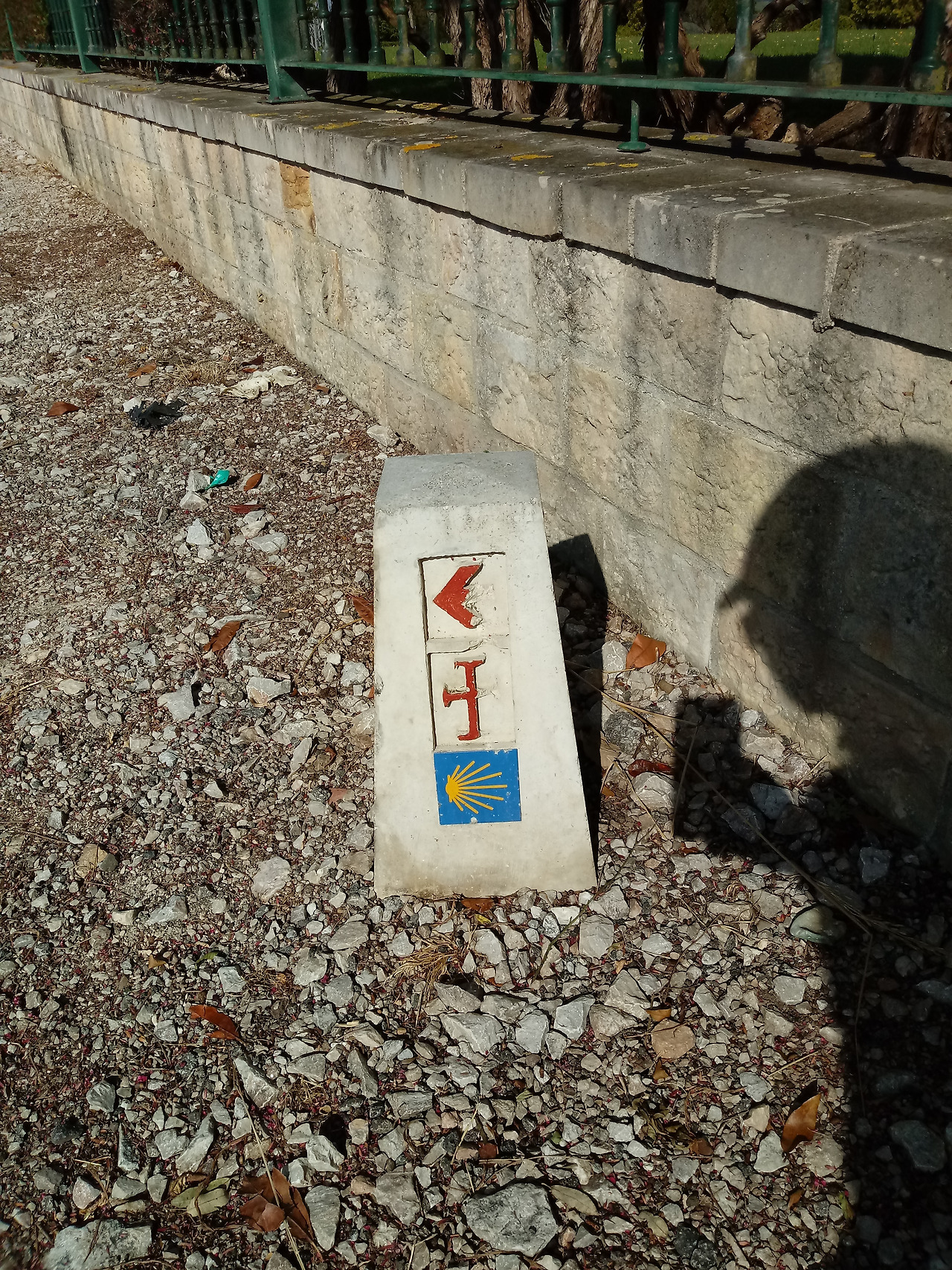 주황색 지붕이 인상적인 도시는 보기에도 오래된 다리를 건너 들어갔다. 원래 다리가 없었고 순례자들을 위해서 배가 운행되었다고 한다. 그런 불편함이 지속되다가 1495년에 지금의 다리가 완공되어서 사람들이 편하게 왕래할 수 있게 되었다. 도시를 통과하다가 여태까지 본 적 없는 다른 안내 표지석을 보았다. 지금까지 봐왔던 조개 모양이 맨 밑에 있고 그 위로 빨간색 십자가가 자리하고 다시 그 위로 빨간색 화살표가 있는 세로로 긴 표지 석이었다. 이곳만의 독특한 표시인가 하면서 다시 걸었다.