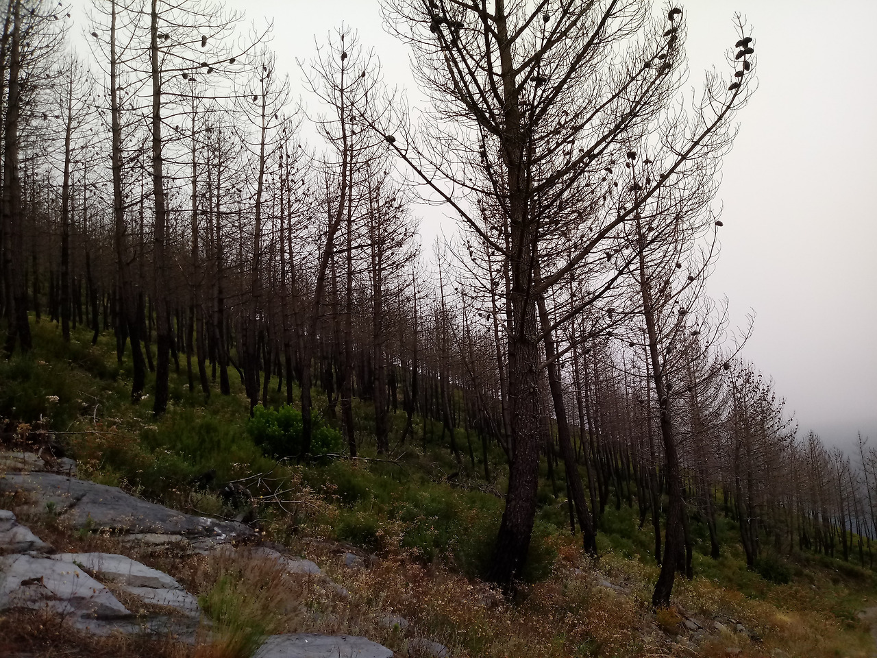 오늘은 댐을 지나는 순례길이었다. 그래서인지 길은 곧바로 가지 못하고 구불구불 돌아갔다. 댐으로 내려가는 길은 가팔랐다. 그런데 보이는 나무들이 하나같이 검게 그을린 자국이 있었다. 아마도 큰 불이 이곳을 휩쓸었던 모양이었다. 큰 바위에도 검게 그을린 흔적이 있는 걸로 보아 매우 큰 불이었음을 짐작할 수 있었다.