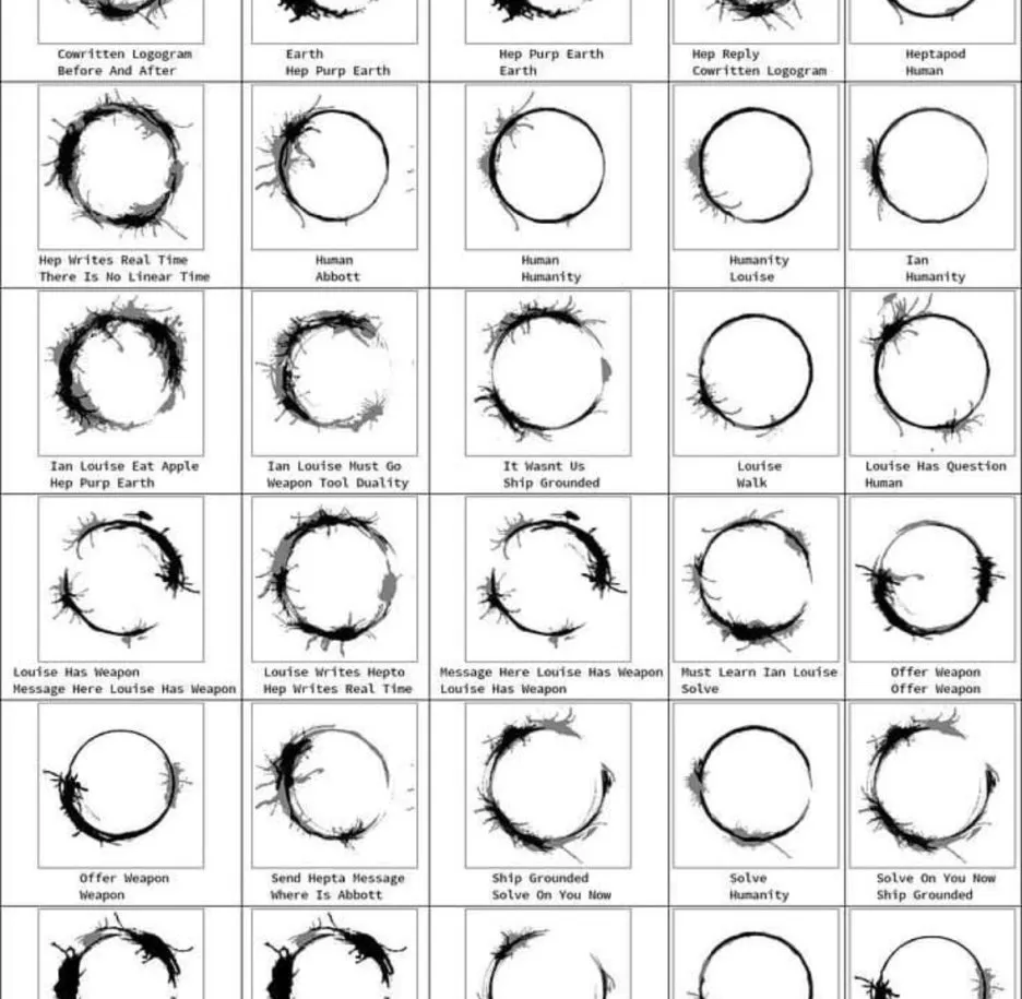 이 영화에서 나오는 외계 생물체인 헵타포드는, 비선형적인 철자법에 따라서 언어를 사용한다. 즉, 그들의 우주선이나 신체처럼 그들의 문자에도 앞뒤 방향이 없다. 다시 말해서 그들은 시간이라는 개념이 없는데, 시작과 끝을 동시에 알고 있어서 문자도 둥근 형태를 띤다.