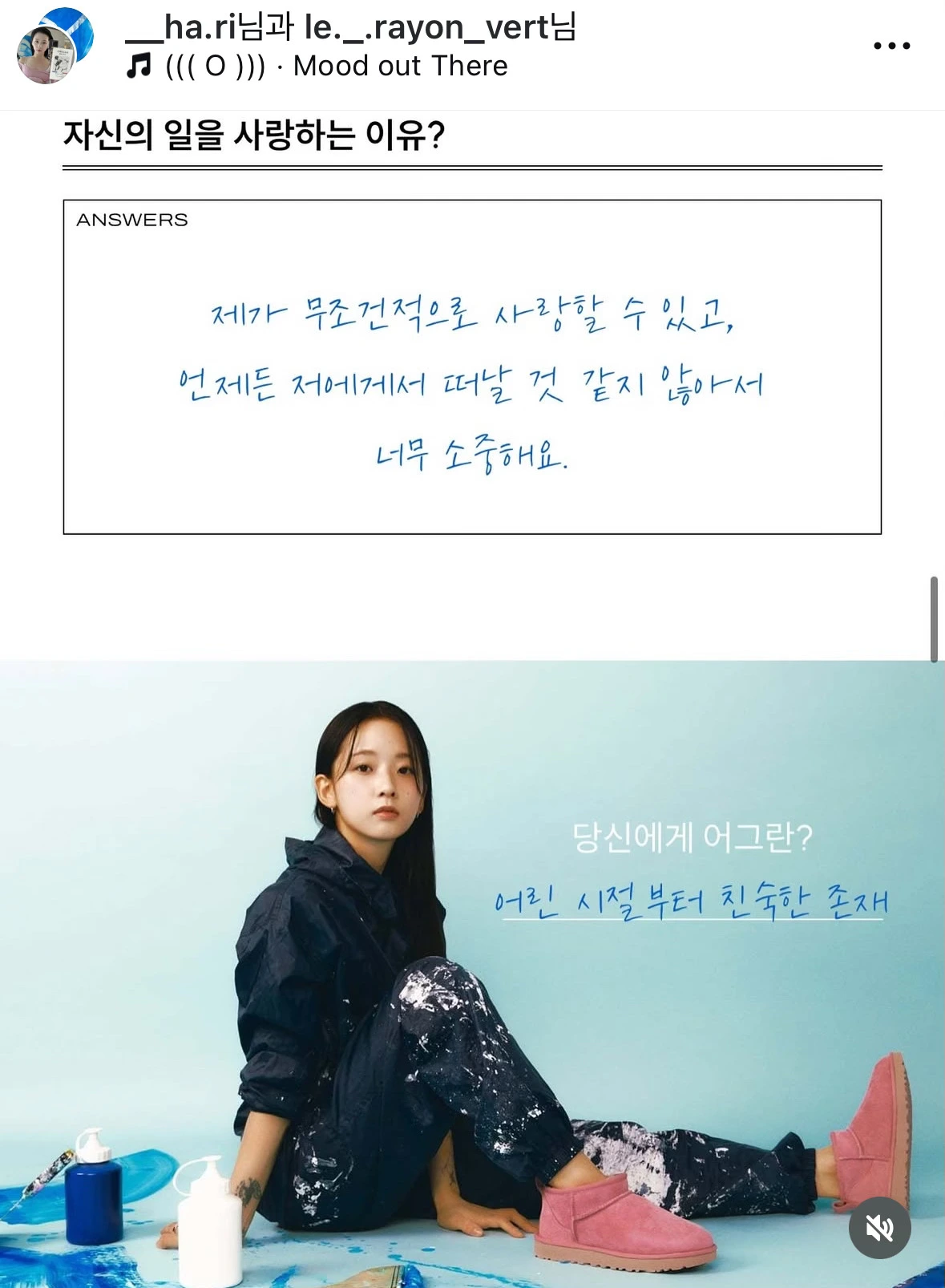 지금 남자친구를 만나기 전까지는 외모에 대해서, 보여주는 것에 대해서도 고민을 많이 했는데, 내가 늙으면 촬영을 못하려나? 하는 불안감도 있었는데 결국에 사람들이 나를 봤을 때 예쁘다고 말하는 것조차도 내 성향에서부터 나오는 자신감과 용기에서부터 좋아한다는 것을 깨닫고 이제는 그러려니 하고 넘기는 것들이 많다.