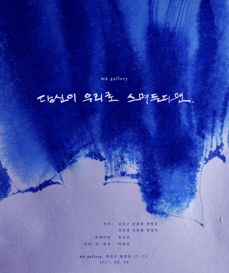 3월 8일 오픈하는 강경석, 김문근, 김민정, 신동원, 신종찬, 전영진으로 이루어진 6인의 전시에서는 MK 갤러리의 과거와 현재 미래가 만난다고 할 수 있다. 전문 미술 교육을 받아온 그들의 과거와 학생이라는 고치를 벗기 위한 전시 ‘당신이 우리로 스며든다면’, 예술에 발붙이고 살아갈 그들의 미래는 MK 갤러리의 변화하고 있는 모습과 닮아있다. 이번 전시는 그들 각자가 탐구해온 세계를 뽐내는 동시에 자신의 작품을 직접 감상하는 기회를 얻고 앞으로의 방향을 짚어보는 과정이 될 것이다. 앞으로도 이 그룹이 지속적인 교류를 통해 서로가 수렴하는 부분을 이해하고 또 반대로 뻗어 나가기도 하는 사상을 공유하며 그룹이 자체가 가지는 스펙트럼이 확장되기를 기원한다.