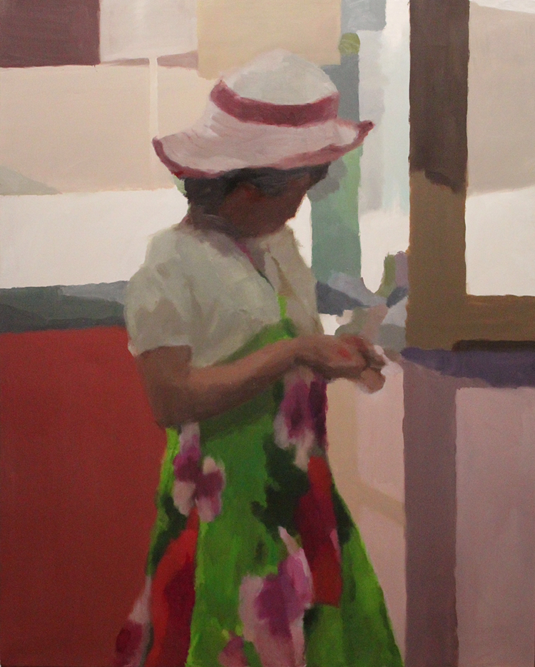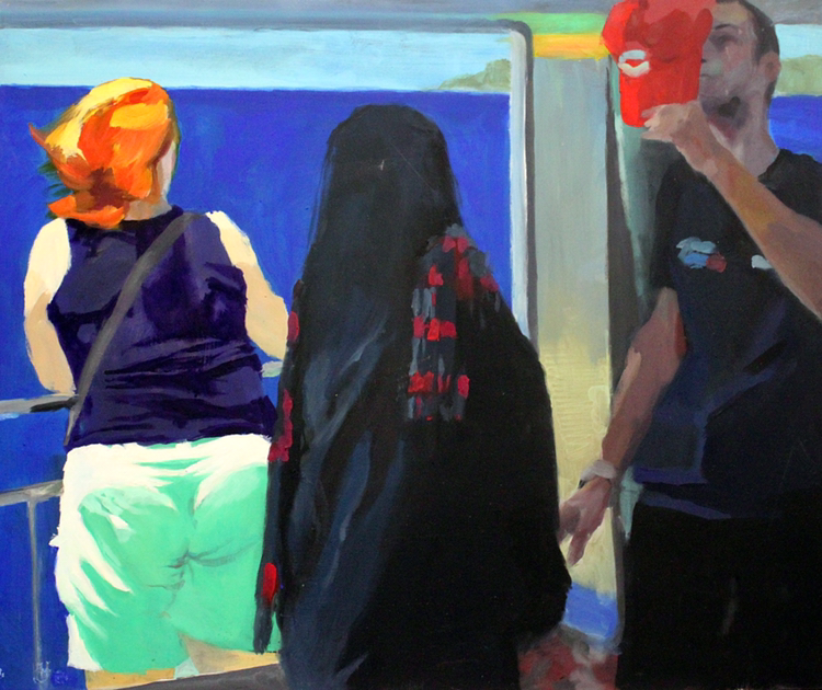 김민정 작가는 일상의 이야기를 작품 속에 담는다. 그녀의 작품은 정적인 동시에 어떠한 소리가 들리는 듯한 효과를 지닌다. 산들거리는 바람에 맞추어 배경의 나무들은 좌우로 움직이고 배 안의 사람의 두건은 바람에 맞추어 미세하게 흔들린다. 하지만 배경과 대비되게 사람들의 행위는 굉장히 정적이고 정지된 것처럼 보인다. 그들은 어떠한 것에 집중하지만 서로를 의식하지 않는, 각자의 세계에 빠진 것 마냥 보인다. 그녀의 그림을 보면 일상에 대한 감각이 느껴지는 것 같다.