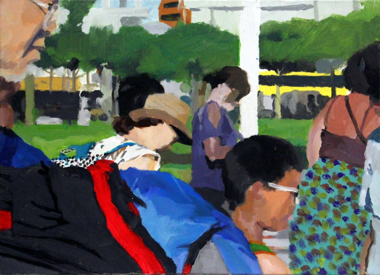 그리고 관람객은 이 작품을 통하여 그림 속의 사람들을 엿보고 있는 듯한 관찰자가 될 수 있다. 과감히 잘린 작품의 구도는 마치 망원경으로 타인을 몰래 바라보는 시선을 표현한 것 처럼 느껴진다. 이로인해 작품을 본 관람객은 어떤 타인의 행위를 ‘엿보고 있는’듯한 느낌을 받을 수 있다. 이는 그녀가 사람과 대하는 방식과 닮아 있다.