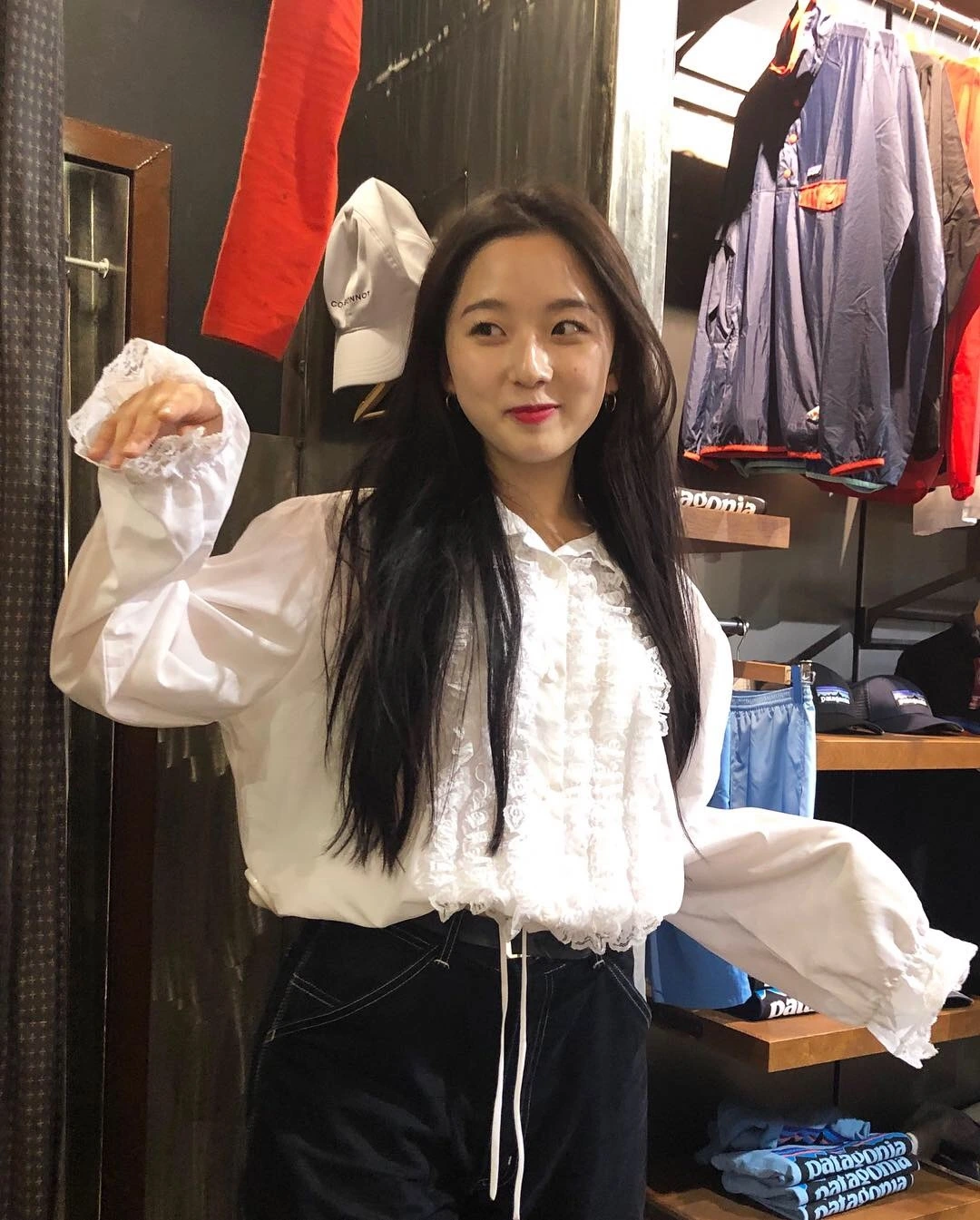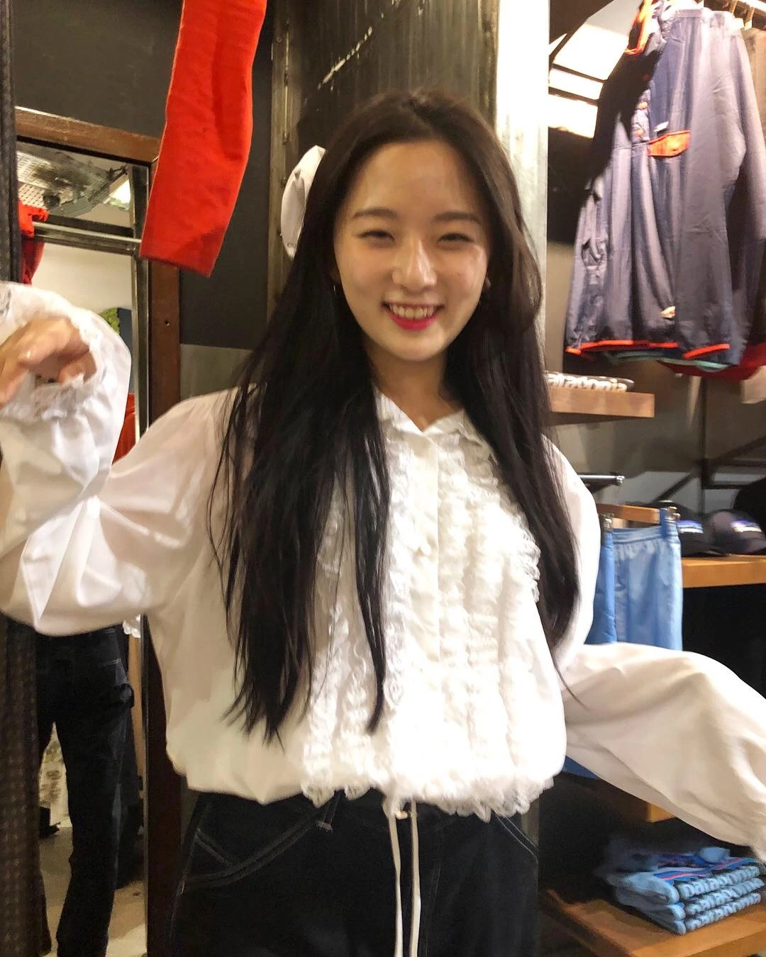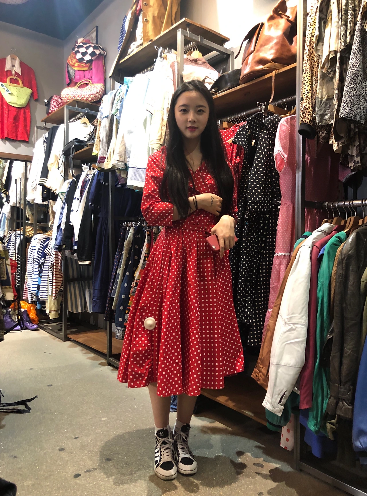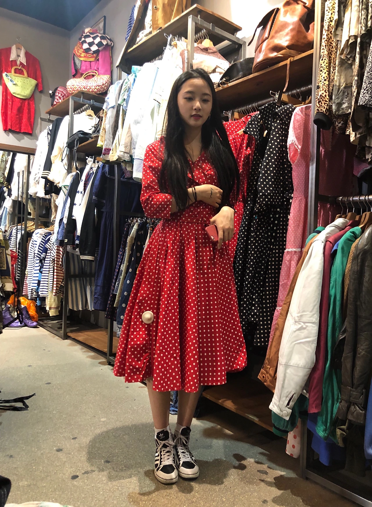 예쁜 땡땡이 옷을 입었는데, 비싸서 입어보기만 했는데 생각보다 더 예뻤다.