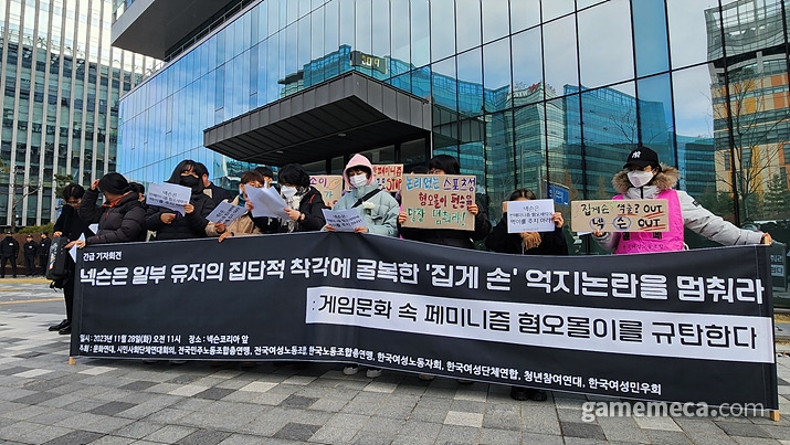 집게손 논란이 '억지논란', '페미니즘 혐오몰이'라며 넥슨에 항의하는 여성단체들. 넥슨노조의 상위 단체인 민노총도 참여했다.