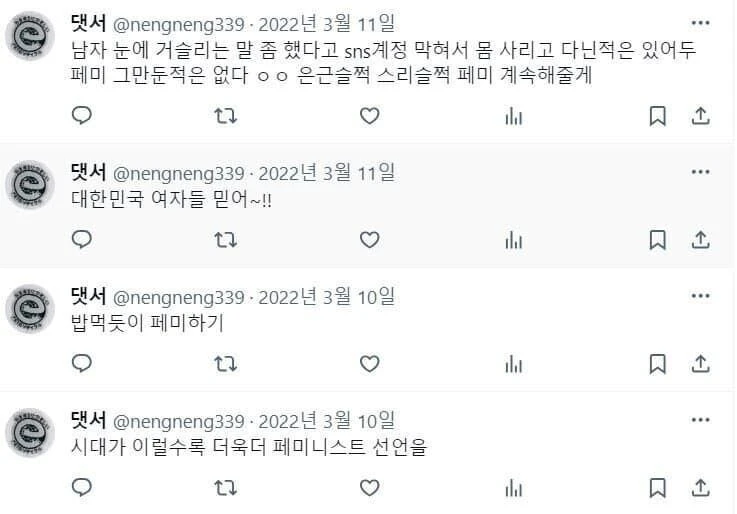해당 이미지의 제작자가 본인의 트위터에 게시한 글. '은근슬쩍 스리슬쩍 페미 계속해줄게'가 결정적인 단서가 됐다.