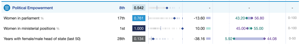 참고로 WEF 성차별 보고서의 정치 분야 평가 항목은 다음과 같습니다.