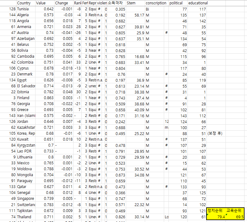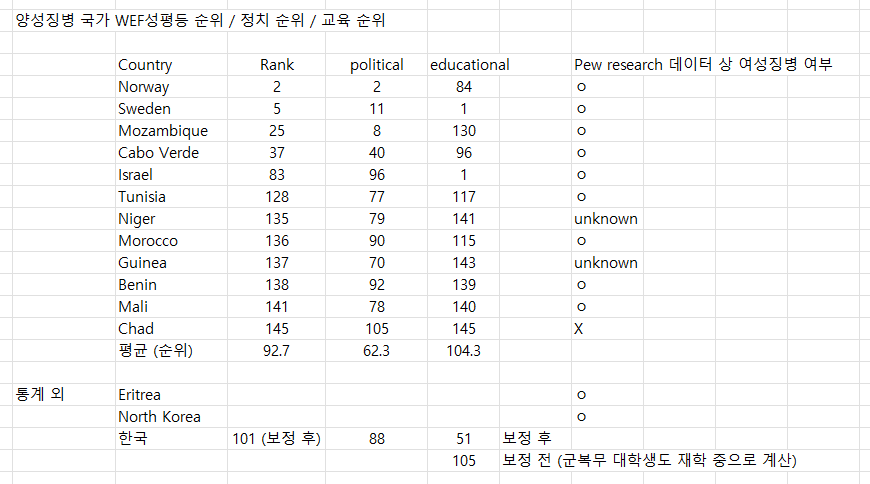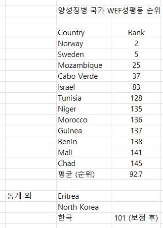 엑셀로 정리해본 징병제 국가 WEF성평등 순위. 최하위가 146위인데 145위까지 있다. 대체로 최하위권이다.