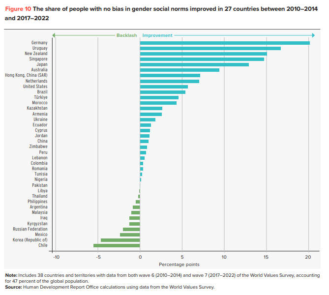 성평등 인식 개선추이. 우리나라는 퇴보했고 심지어 뒤에서 2위다. 참고로 2022년 한국의 성평등인식 순위는 91개국 중 38위. 나름 괜찮은 순위인데 이걸 언급한 언론은 없었다.
