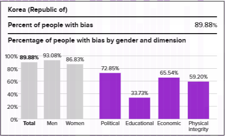 한국인의 성차별적 인식은 남성 93%, 여성 86%로 남녀가 서로 거기서 거기다.