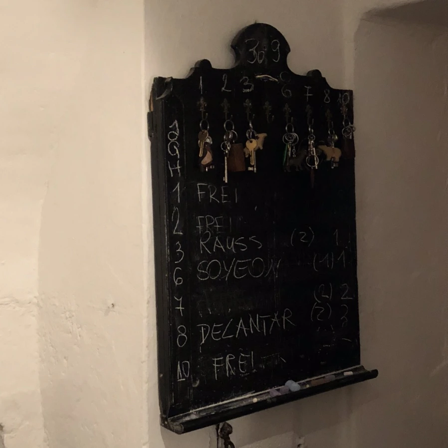 할슈타트에서 저는 '브로이가스트호프'라는 작고 오래된 숙소에서 머물렀습니다. '가스트호프(Gasthof)'는 오스트리아의 오래된 호텔을 부르는 이름이라고 하는데요. 무려 15세기 건물이었죠. 심지어 영어로 말해야 했기에 처음 체크인을 할 때는 살짝 떨렸지만, '당신을 위해 멋진 방을 준비했어요'라고 말하며 따뜻하게 맞아주시는 주인 아주머니 덕분에 마음이 편안해졌어요. 오래된 호텔답게 아날로그의 느낌이 물씬 풍기는 묵직한 열쇠를 건네받을 때, 열쇠가 걸려있던 칠판에 호기심이 생겼습니다.