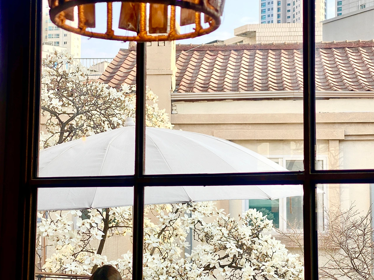 목련이 활짝 피었다. 굿뉴스라는 카페이름에 잘 어울리는 소식이다.