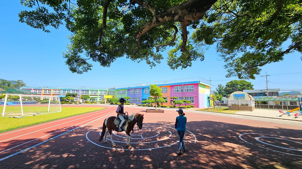 우리 가정은 강진에 내려오기 전, 아이들과 농산어촌 홍보 영상을 통해 팽나무학교에서 말 타는 아이들의 모습을 보았었다. 어쩌면 이 영상이 아이들의 마음을 사로잡았지 않았나 싶을 정도로 아이들은 승마에 대한 기대감이 컸다. 학교 운동장에서 말 타는 모습은 흔하게 볼 수 있는 광경은 아니었기에...