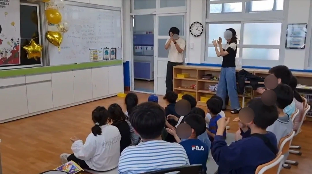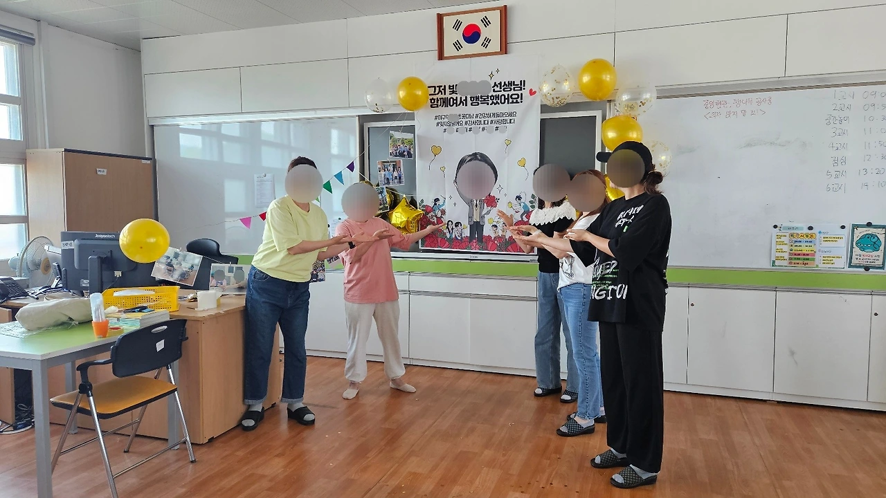 앞문이 열리는 순간, 우리는 교실 전등을 환하게 켰고, 앞에서 대기하고 있던 몇몇 아이들은 선생님을 향해 꽃가루를 날렸다. 그리고 노래가 시작됐다.