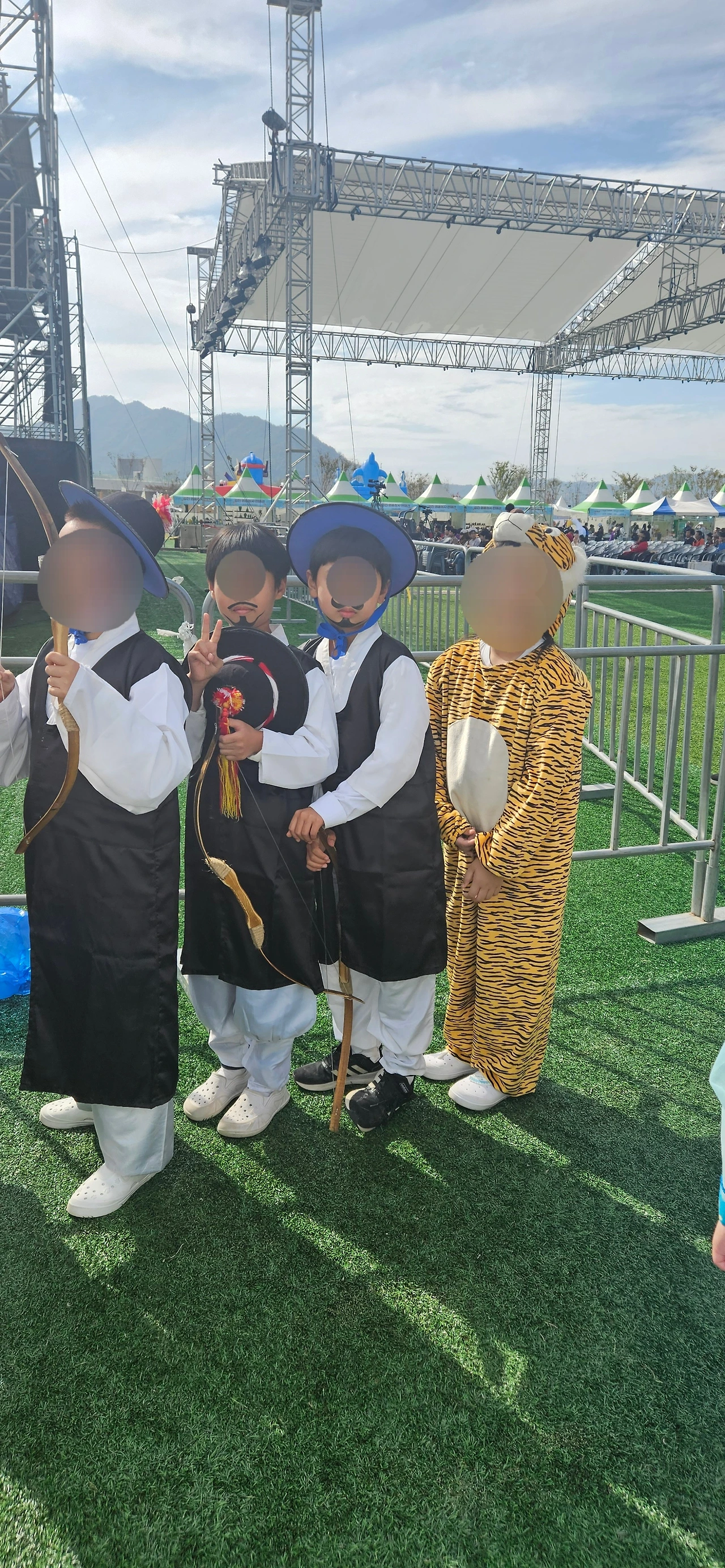 드디어 팽나무 학교 아이들의 무대 시간이 다가왔다. 저쪽에서 포졸 분장과 포졸의상을 입은 귀여운 아이 두 명이 지나갔다. 우리 집 4,5호다. 그 뒤에 3호인 원님도 지나가고 또 팽나무 학교 아이들도 줄을 서서 지나갔다.