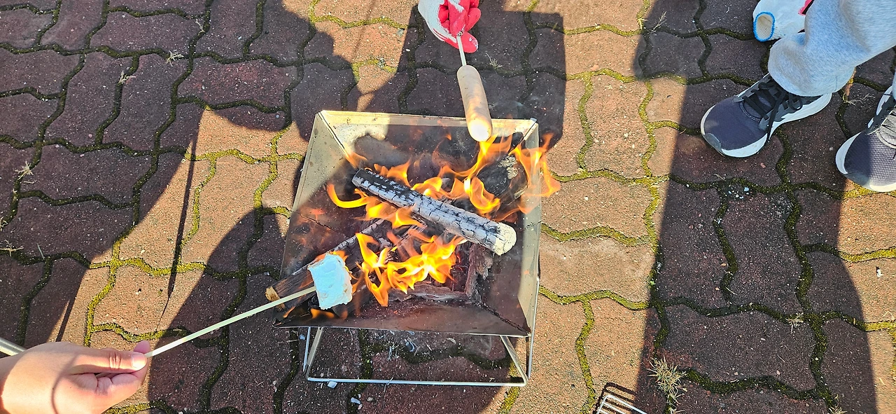다음은 아이들이 직접 마시멜로와 소시지를 구워서 먹었다. 화로의 불길도 마시멜로의 달콤함을 알아차렸다. 하얀 마시멜로를 까맣게 태워버리는 것을 보면.