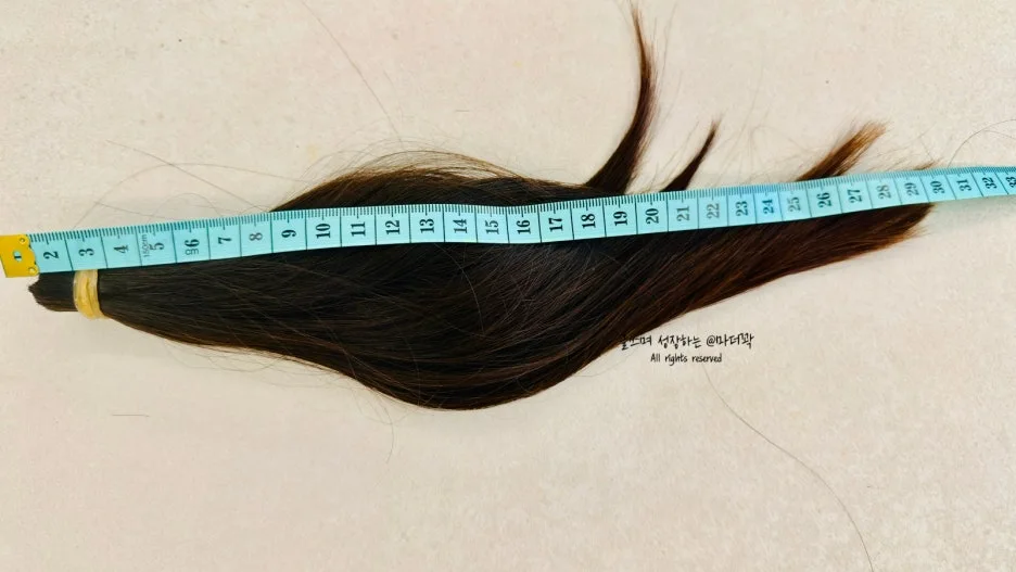 미용실 예약하면서 이야기했더니 종종 있는 일이라는 듯, 25센티 이상이였죠? 말씀하시면서 자를 가지고 오신다. 내가 가지고 갔던 건 비닐뿐이였는데. 고무줄도 능숙하게 묶어서 머리카락을 싹뚝! 잘라주신다.