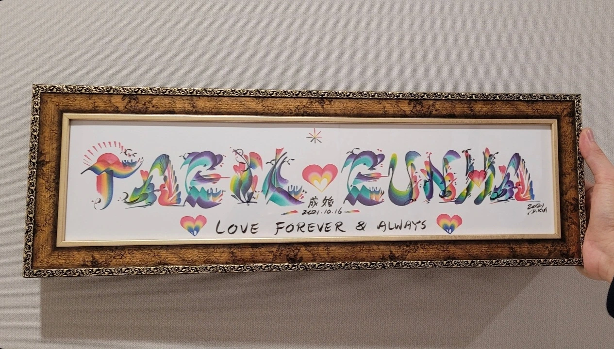아래 사진은 오늘 아주 인상적이었던 부부입니다. 밝은 베이지색 커플룩 옷을 입은 노 부부인데 본인들의 이름을 함께 쓰면서 43년을 함께했다며 이름 아래에 'In love forever'를 적어달라고 하더군요. 정성 들여 두 사람 이름을 그려주었더니 아주 행복한 얼굴로 팁까지 주고 가셨답니다.