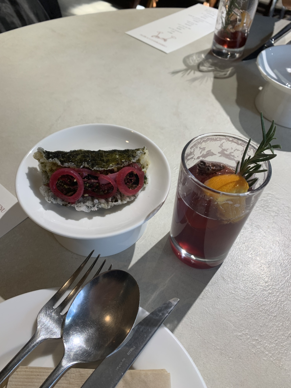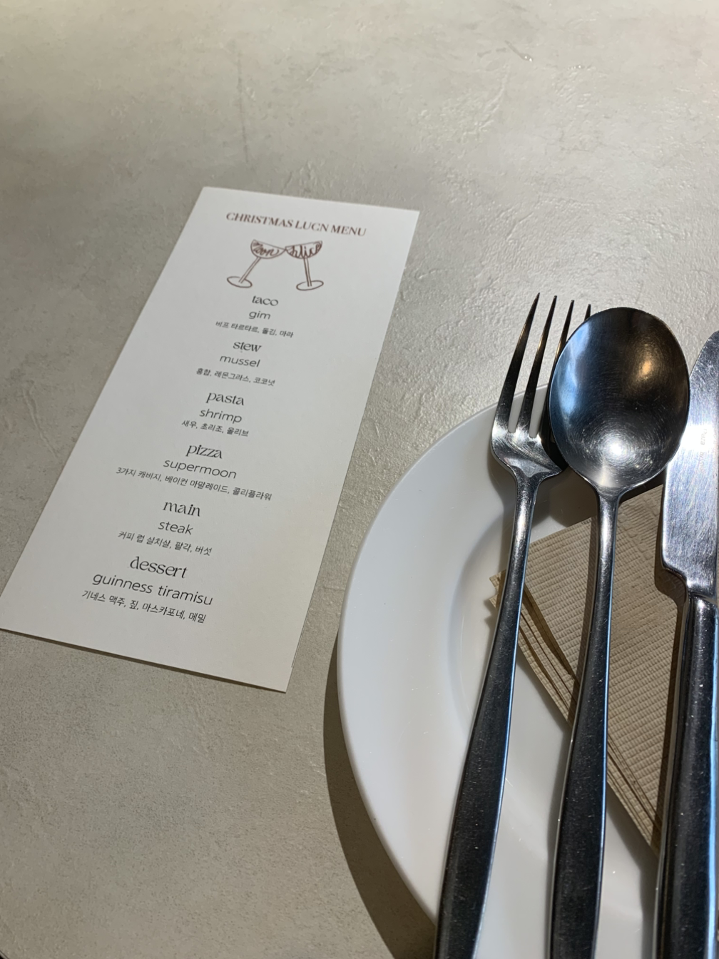 이번에 갔던 식당은 흑백요리사에 나왔던 문쥬스라는 식당인데 한 달 전에 예약에 성공했다. 김과 마라를 넣은 타코, 차가운 탄산음료 형태의 뱅쇼, 레몬그라스와 세비체 소스가 곁들여진 홍합, 사워크라프트와 베이컨마리네이드를 얹어낸 피자, 커피 럽 살치살 스테이크, 기네스 맥주를 졸인 소스를 얹은 티라미수 처럼 기존 재료들을 새롭게 믹스 앤 매치하여 탄생시킨 요리들은 크리스마스를 더욱 즐겁게 해준다.