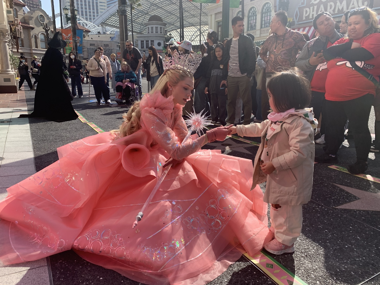 그리고 중간중간 유니버설 스튜디오의 영화 주인공들을 만날 수 있었는데, 배우들의 미모가 상당하다. 개인적으로 Wicked의 글린다 배우님이 너무너무 예뻤다. 내 기준 아리아나 그란데보다 더 예뻤음. 그리고 대화도 해 준다. 딸아이는 얼음이었지만 공주님 손을 잡고 싶었던 것 같다.