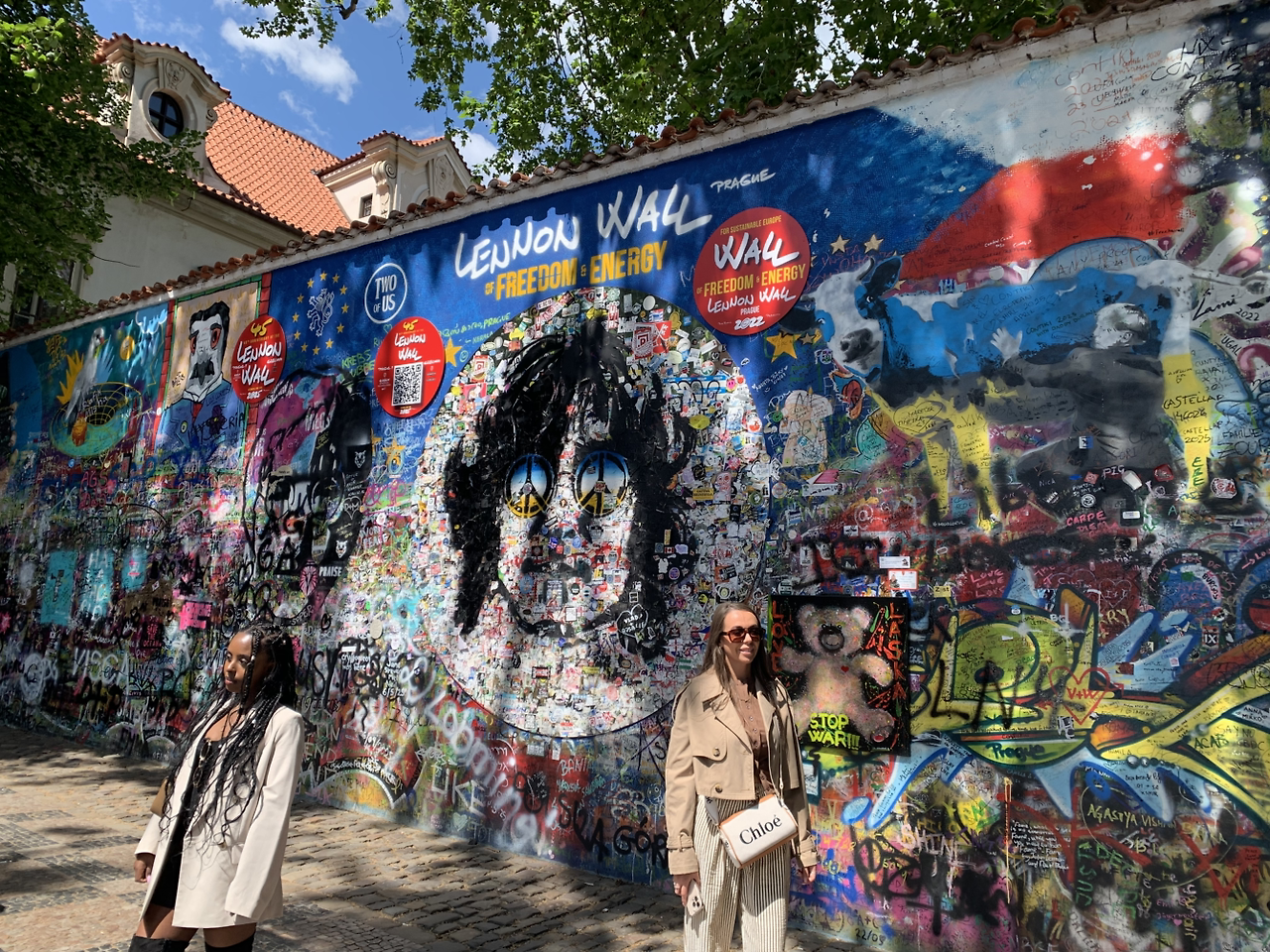 까를 교 근처에 붙어 있는 레논벽도 가본다. 동유럽 청년들의 자유의 상징적인 산물이 되어버린 레논벽은 레논 얼굴이 보이면 가려지고 또 그 위에 그림을 더 그리고 하는 식으로 명맥이 유지되는 것 같다. 내가 갔을 때에도 저 벽에 낙서하려고 하는 사람들이 많았다. 가만 보니 체코 국기도 오른쪽 위에 있다. 각 색상마다 상징이 있었는데 지금은 붉은색이 체코의 독립을 위한 붉은 피라는 것만 생각난다.