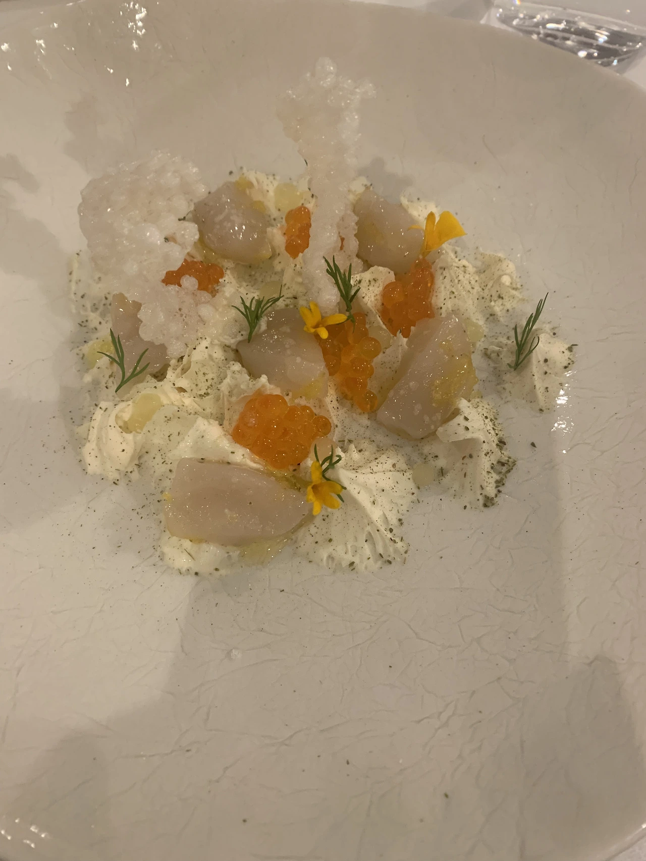 • Scallop & Caviar: 신선한 관자와 톡톡 터지는 연어알, 그리고 마치 산호처럼 피어오른 튀일의 조화는 바다의 풍미를 예술적으로 재해석했다.