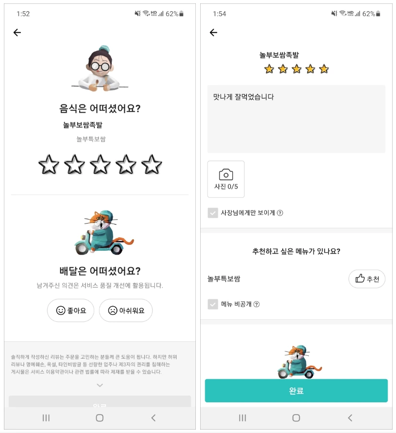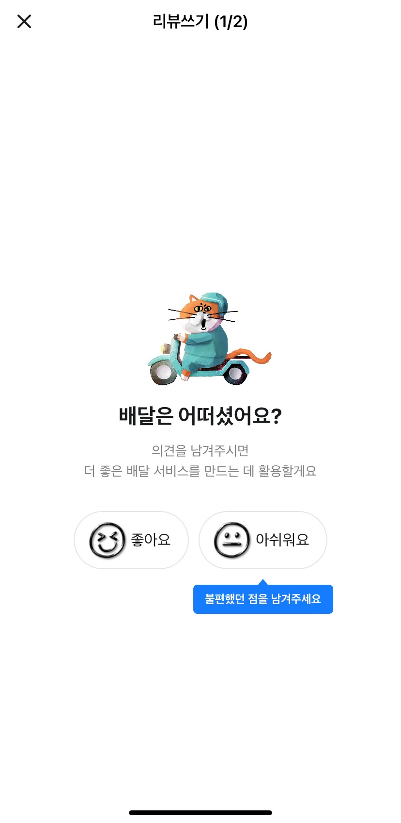 > 배달평가만 하면 되고, 좋아요/아쉬워요 둘 중 하나만 선택하면 되니 리뷰입력의 허들이 낮아져요.