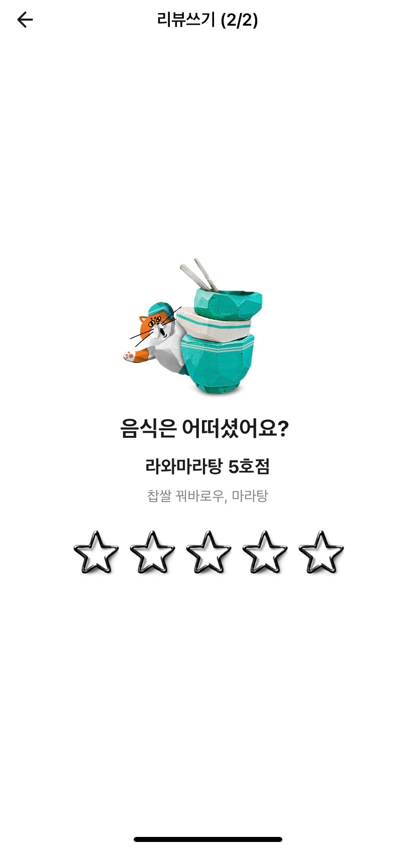 하지만 현재는 배달평가 > 별점 > 리뷰작성 > 작성완료의 흐름으로 구성되어 있어요.