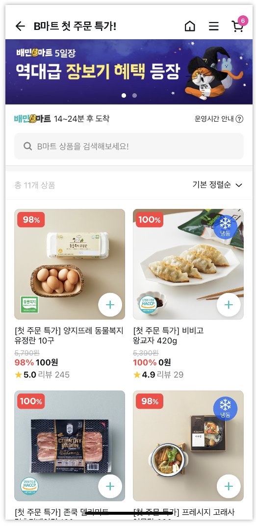 B마트 첫 주문 특가도 마찬가지로 단돈 100원이나 0원으로 제품을 구매하도록 유도하고 있어요. 일단 B마트 서비스를 접하게 해서 서비스를 높게 평가하도록 유도하는 거죠!