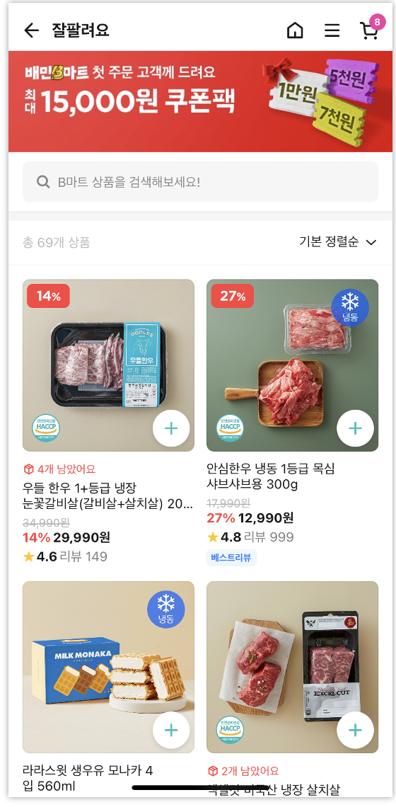 배민 B마트의 '잘 팔려요' 카테고리예요. 상품이 그렇게 많지는 않아요.