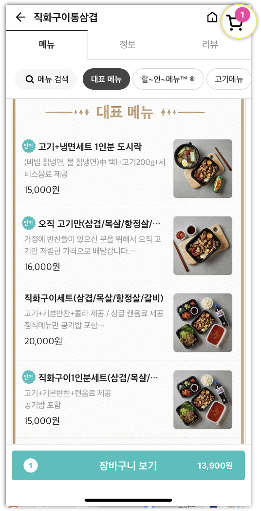 카트에 음식을 담은 후 다른 음식을 살펴볼 때도 담은 메뉴가 상단에 계속 떠있죠~