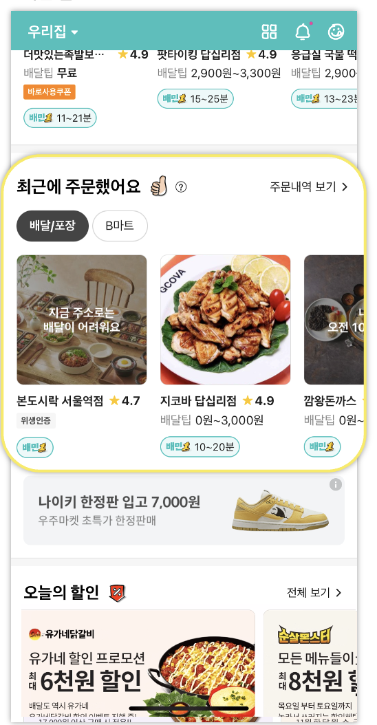 배민 메인 하단에 있는 '최근에 주문했어요' 영역이에요.