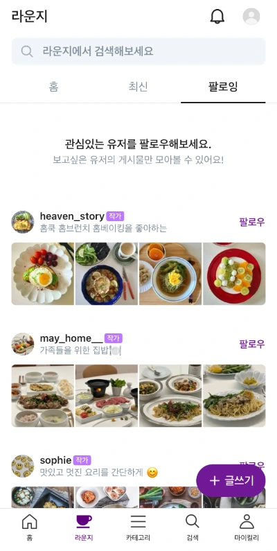 팔로잉하는 대상이 없는 경우, 팔로우할 만한 유저를 5명 추천해 준다. 일주일 이내에 게시글을 올린 활성 유저를 대상으로 보여준다. 또한, 메인 이미지가 4장 보이기 때문에 최소 게시글 4개 이상 올린 유저를 추천한다. 아래로 스크롤을 내리면 페이지가 새로고침되면서 새로운 유저 5명을 볼 수 있다.
