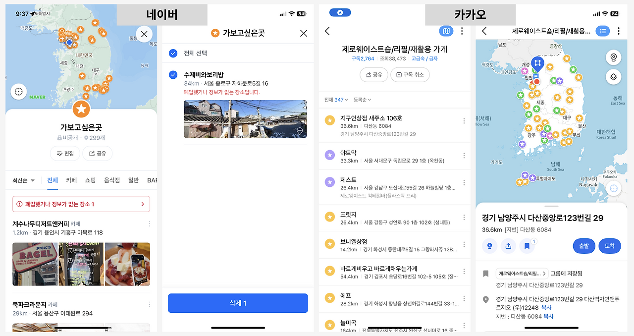 네이버는 리스트별로 색상을 다르게 설정할 수 있고, 카카오는 장소별로 색상을 다르게 설정할 수 있다. 네이버에서는 색상의 차이를 리스트 항목명으로 구분해 알아볼 수 있지만 카카오는 지금 색상을 선택해 저장하더라도 나중에 '어? 내가 어떤 기준으로 구분하고 있었지?'하고 쉽게 혼동이 올 수도 있을 것 같다.
