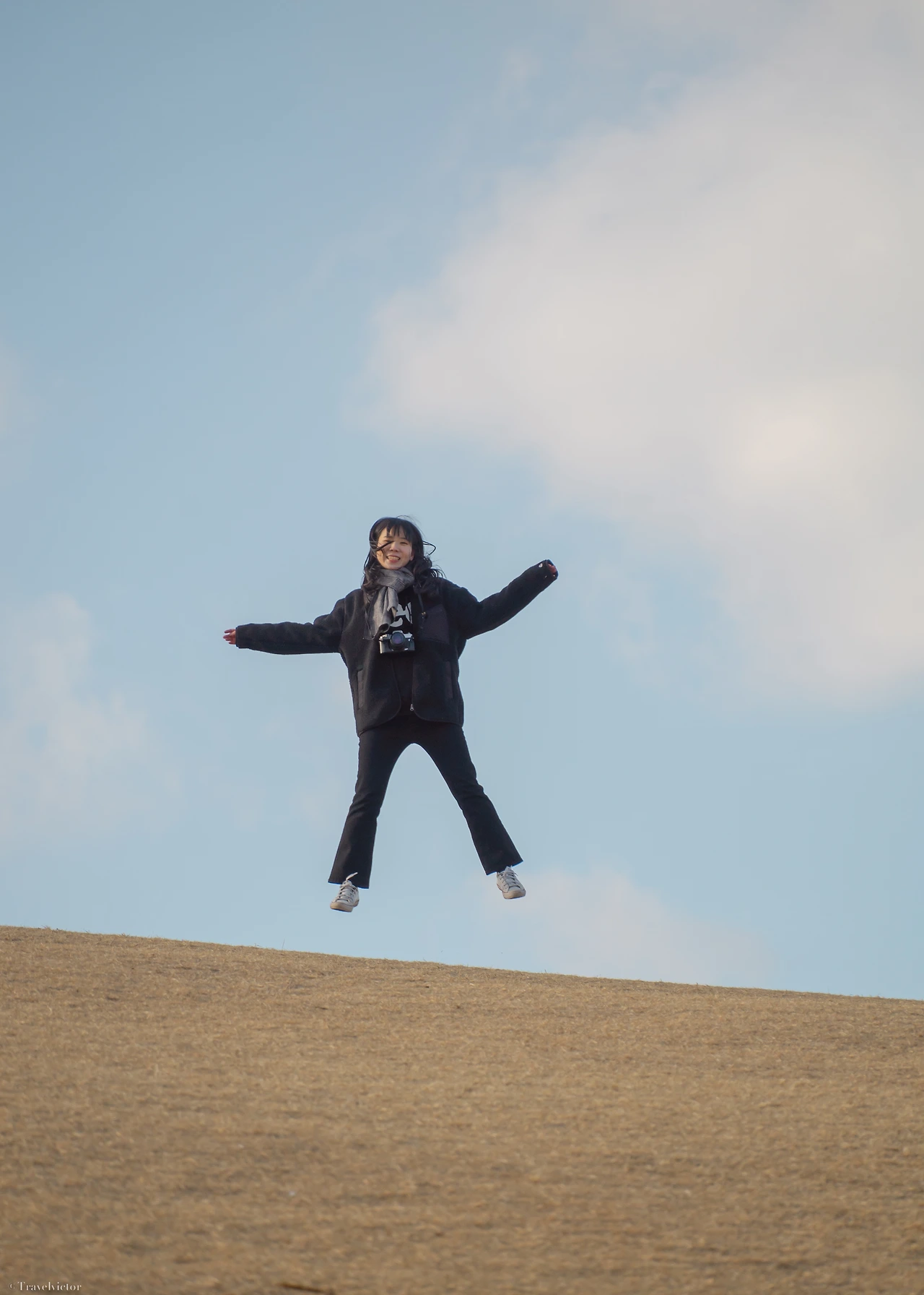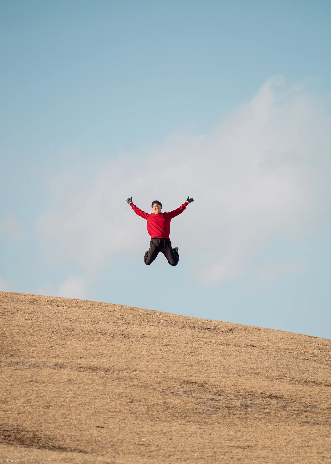 파란 하늘과 혼자 있는 언덕에서 점프를 하면 예쁜 사진이 나올 것 같아서 우리 다들 한 번씩 점프를 뛰었다. 나도 점프를 뛰었고, 재인이 누나와 지윤이 누나도 점프를 뛰었다. 여름이 아니라서 다행이었다. 만약 여름이었다면 땀을 뻘뻘 흘렸을 것이다.
