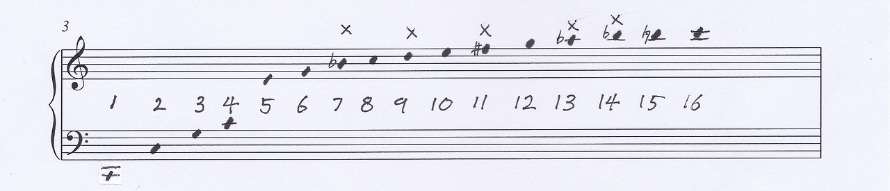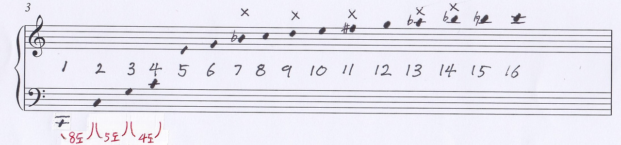 그럼 좀 더 자세한 설명을 위해 [C와 G], [C와 D#]으로 생각해보자. 제일 왼쪽 1번은 C, 기음이다. 그리고 오른쪽으로 두 칸 넘어가면 숫자 3G가 있다. C는 배음으로 G의 기음을 포함하고 있으므로 협화음이라 할 수 있다. 거기에 G는 전체 배음에서 기음과 굉장히 가까운 편이기 때문에 협화음중에서도 아주 잘 어울리는 편이라고 할 수 있다. 왜? C를 눌렀을 때 자연적으로 발생하는 배음안에는 이미 G가 포함되어 있기 때문이다. 같은 맥락에서 C와 D#으로 생각해보자. C의 배음렬에는 D#(레#)이란 음이 존재하지 않는다. 따라서 C와 D#은 불협화음이다. 이제 대충 음과 음이 어떤 식으로 작용하는지 알았으리라 생각한다. 이제 딱 한 번만 더 아래의 배음렬을 보자.