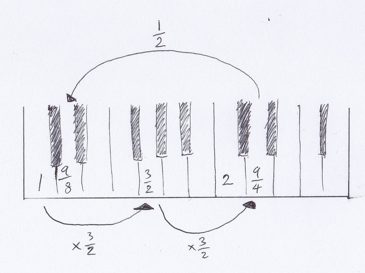 계산의 편의를 위해 C의 주파수를 1이라고 가정하자. 완전 5도의 주파수 비는 3:2로, C를 기준으로 완전 5도씩 음을 쌓는다고 가정할 때, C의 완전 5도인 G의 주파수는 1 X 3/2로 1.5가 된다. 마찬가지로 G의 완전 5도를 찾으려면 3/2를 곱해주면 된다. 3/2 X 3/2 = 9/4 즉, 2.25가 되는데 이 경우엔 한 옥타브가 넘어가기 때문에 X 1/2을 하여 옥타브를 떨어트려준다. 그렇게 되면 9/8이 되고 이는 D가 된다. 이러한 방법으로 계속해서 완전 5도씩 쌓아 가다 보면 최종적으로 12개의 음이 완성되는데, 이 12개의 음이 완전 화음에서 출발한 하나의 음계(Scale)가 된다. 이게 최초의 음률이자 음악이론의 첫걸음이 된 피타고라스 음률이다.