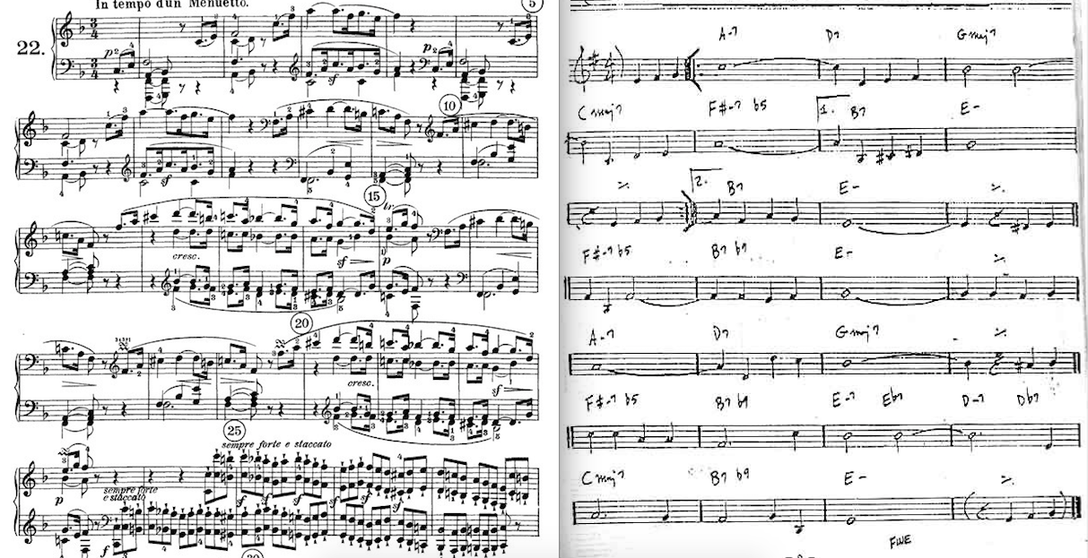 왼쪽은 클래식곡 '베토벤 피아노 소나타 22번'의 악보고 오른쪽은 재즈 스탠더드 'Autumn leaves'의 악보다. 서로 다른 곡이긴 하지만 맥락은 같다. 재즈 악보는 간단하게 멜로디와 코드 정도만 기보 되어있는 반면, 클래식 악보는 어느 세기로 연주할지, 어느 부분에서 끊어 칠지, 보이싱은 어떻게 해야 할지에 대해 상세하게 기보 되어있다.