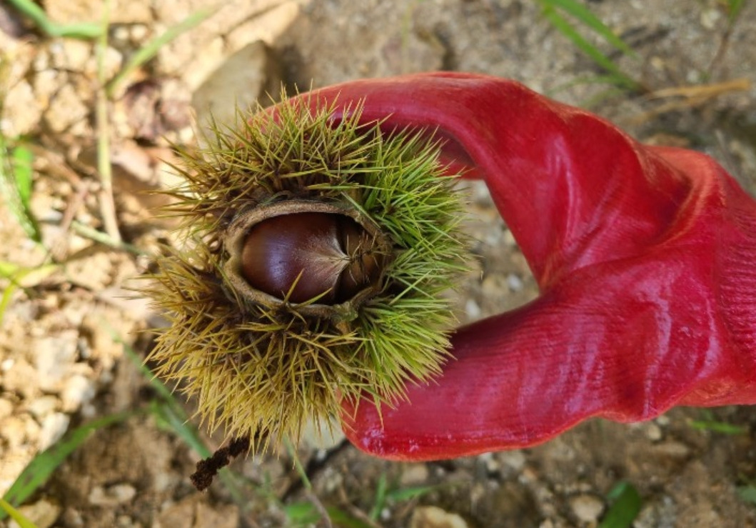 장갑을 챙겨서 발로 밟아 안에 알밤을 꺼낸다. 밤송이가 떨어진 자리에 주변을 보면 굴러 떨어진 밤이 있어 줍기만 하면 된다. 산길을 쭉 따라서 가다 보면 땅에 도토리와 밤이 떨어져 있다. 큰 알밤만 줍고 나머지는 산짐승들에게 양보한다. 그렇게 양 주머니가 가득해져서 돌아온다.