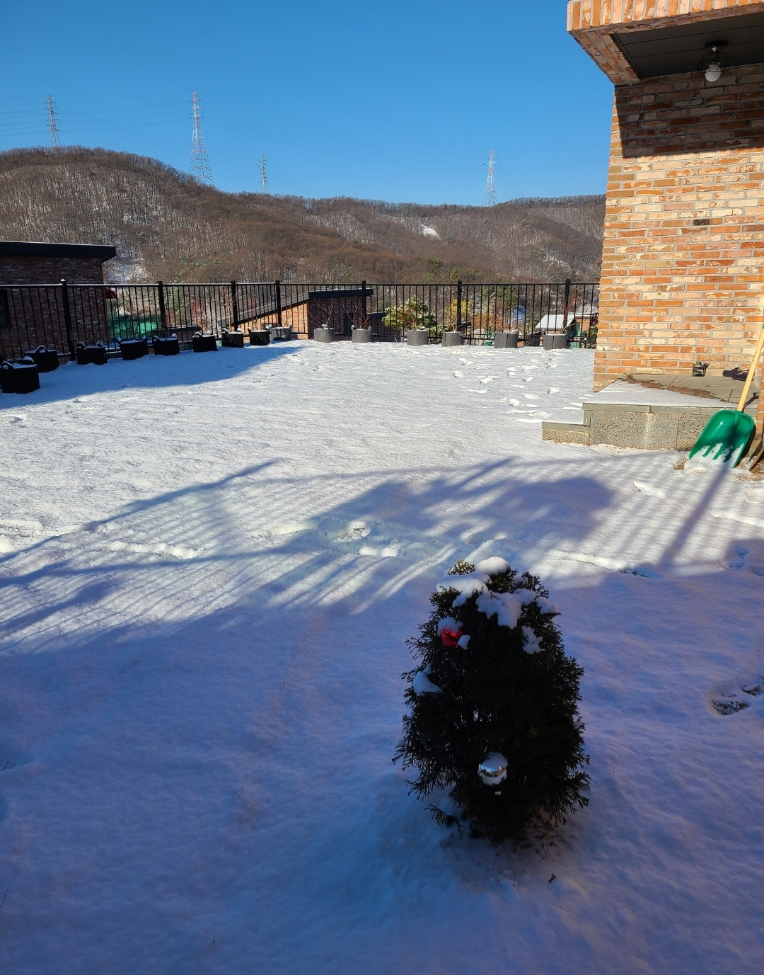 제설을 하는 데 기대했던 힘듦보다 눈이 많이 와서 재미가 컸다. 넉가래가 커서 밀어내니 금방 금방 정리가 되었다. 계단도 쓸고 그러다가 눈을 모아서 던지기도 하고 옷 속에 넣어 냉마사지도 해주다가, 눈사람도 만들고 아무튼 즐겁게 재설을 마쳤다.