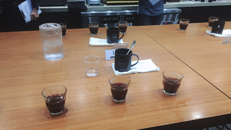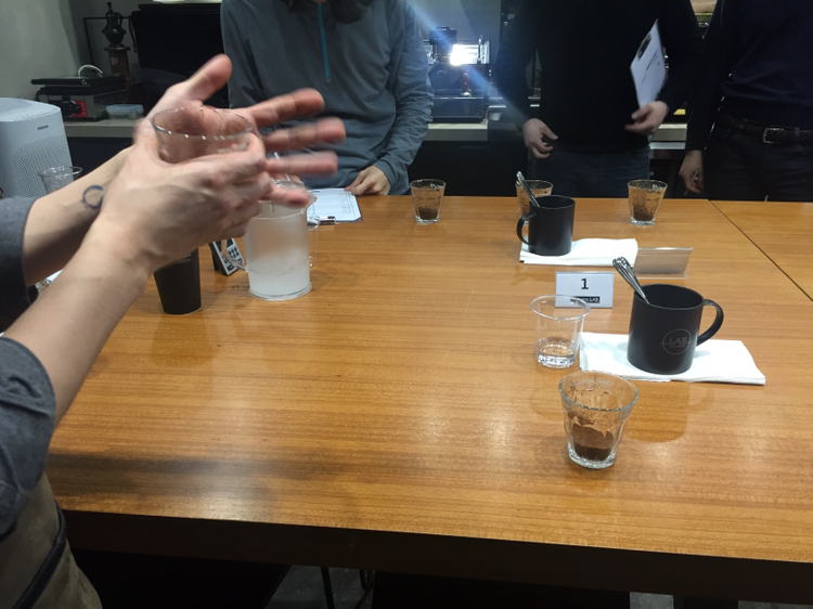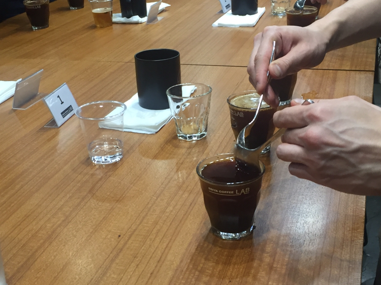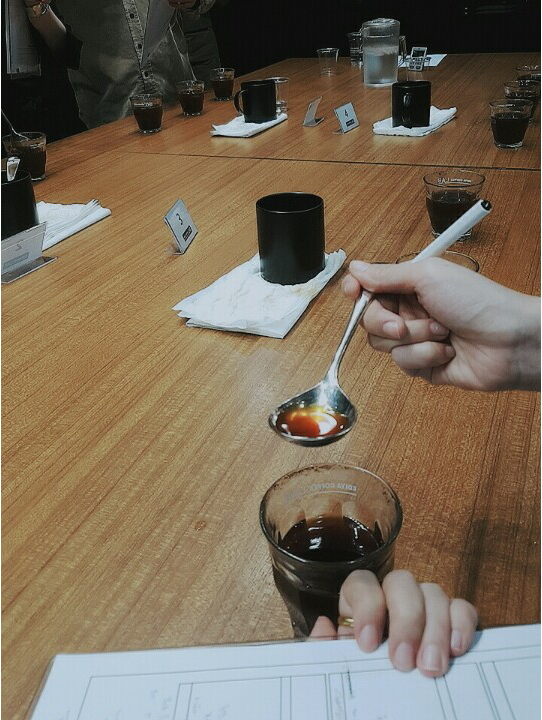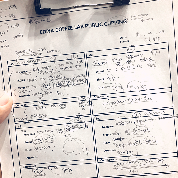 이 때 주의점은 커핑 스푼을 컵에 한번 씻고 휴지에 찍어낸 다음 커핑 볼에 스푼을 담구는 것인데 계속 담굼질(?)을 하다보면 커피 위에 무언가 둥둥 떠있다. (안돼. 난 전문가가 될 거니까 예의를 지켜, 음미만 하고 뱉자)