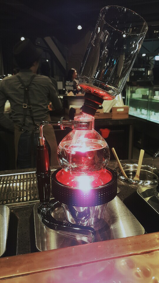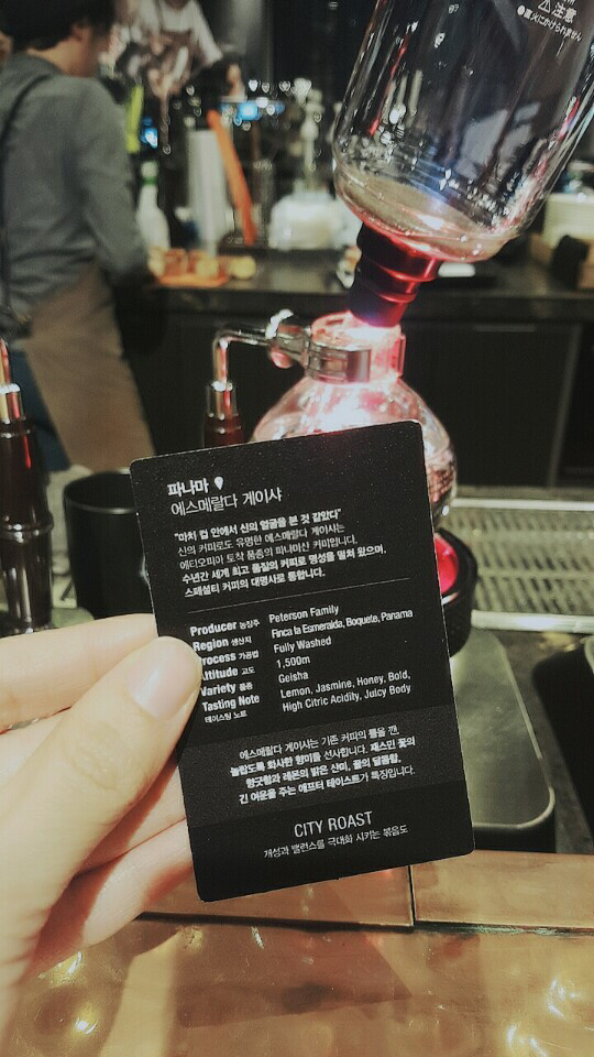 커핑 후 이디야커피랩에 사이폰 추출대회에서 상을 받았던 신창호 바리스타님의 커피를 맛보고 싶었으나, 하필 휴무일이어서 다른 수제자 분의 사이폰 커피를 마셨다. 그것도 파나마 게이샤로..