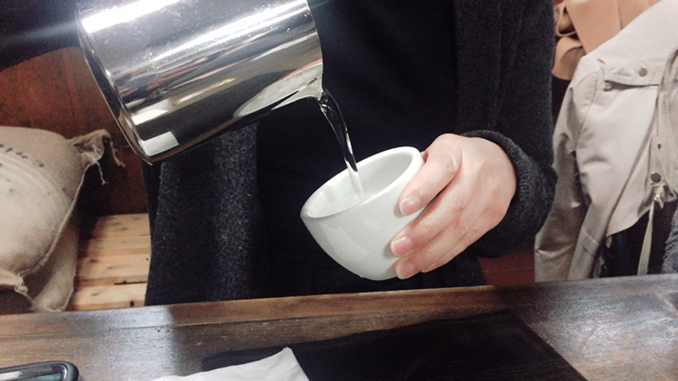 잔을 충분히 기울여서 30ml의 물(에스프레소 샷)이 새끼손가락 하나가 들어가게 기울인다.
