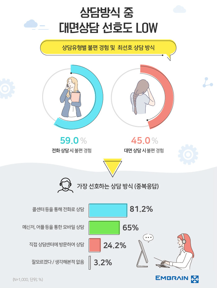 트랜드모니터에 따르면 전화 상담 59% 불편 경험, 대면 상담 불편 경험은 45%라고 한다.